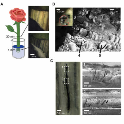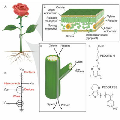 Eine Rose ist eine Rose ist eine Rose. Oder eine Leiterplatte. Illustrationen zur grundlegenden Pflanzenphysiologie und zur Analogie zur Elektronik (links) und zu elektronisch leitenden Xylem-Drähten (rechts). Quelle: https://advances.sciencemag.org/content/1/10/e1501136